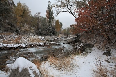 A beautiful combination of snow and bright autumn leaves!