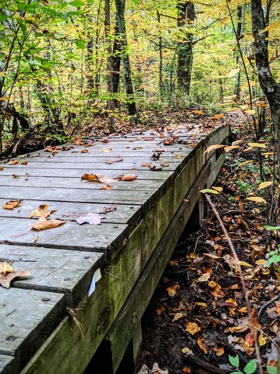 A footbridge into colorful fall foliage.