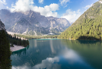 A nice place! Mountains with clouds are reflected in the water!