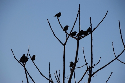 silhouette of birds on bare branches of tree in winter
