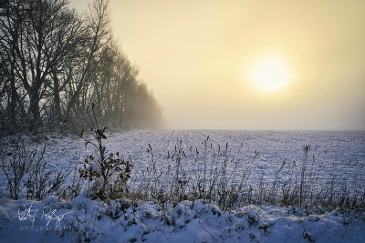 Feld im Winter mit Schnee und Nebel