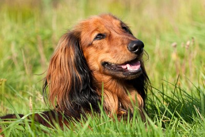 Chester, long-haired dwarf dachshund.