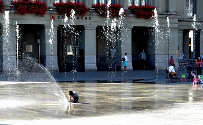 Pranks child by the fountain