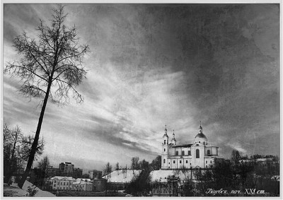 On the tree, the sky and the church.