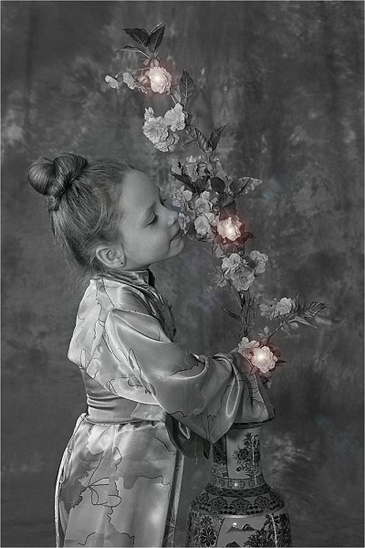 With a sprig of cherry blossom