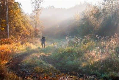 Nice morning, but I didnt guess the breed of the dog: I was thinking of a hound, but a black tail sticks out. If only Anglo-Russian with a black rut.