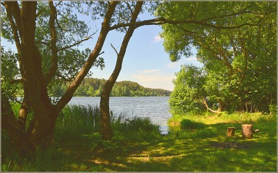 in the shade near the shore