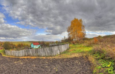 It turned out interestingly! A lonely blue cottage surrounded by a fence in a circle, in a large space. ...Like!