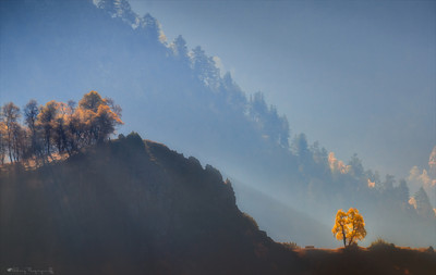 Lighted trees in the lower right corner create the atmosphere of the photo.