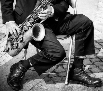 The main thing is chic shoes that say a lot about the saxophonist, more than the instrument itself.