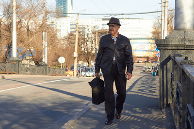 He is walking through the city
