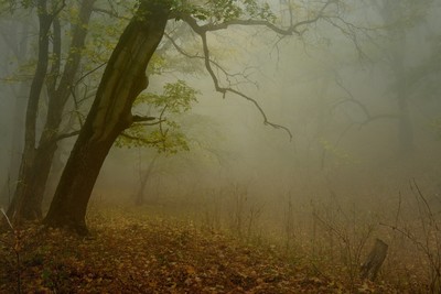 The remnants of (green) Summer on Autumn trees against the backdrop of fog. The beauty and poetry of Nature. Beautiful picture. Congrats.